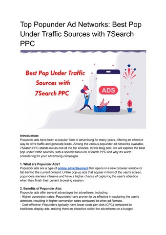 Popunder networks are advertising platforms that specialize in delivering popunder ads. These networks help online businesses reach a wider audience and increase their website traffic through popunder ads which appear in a new browser window underneath the current window.