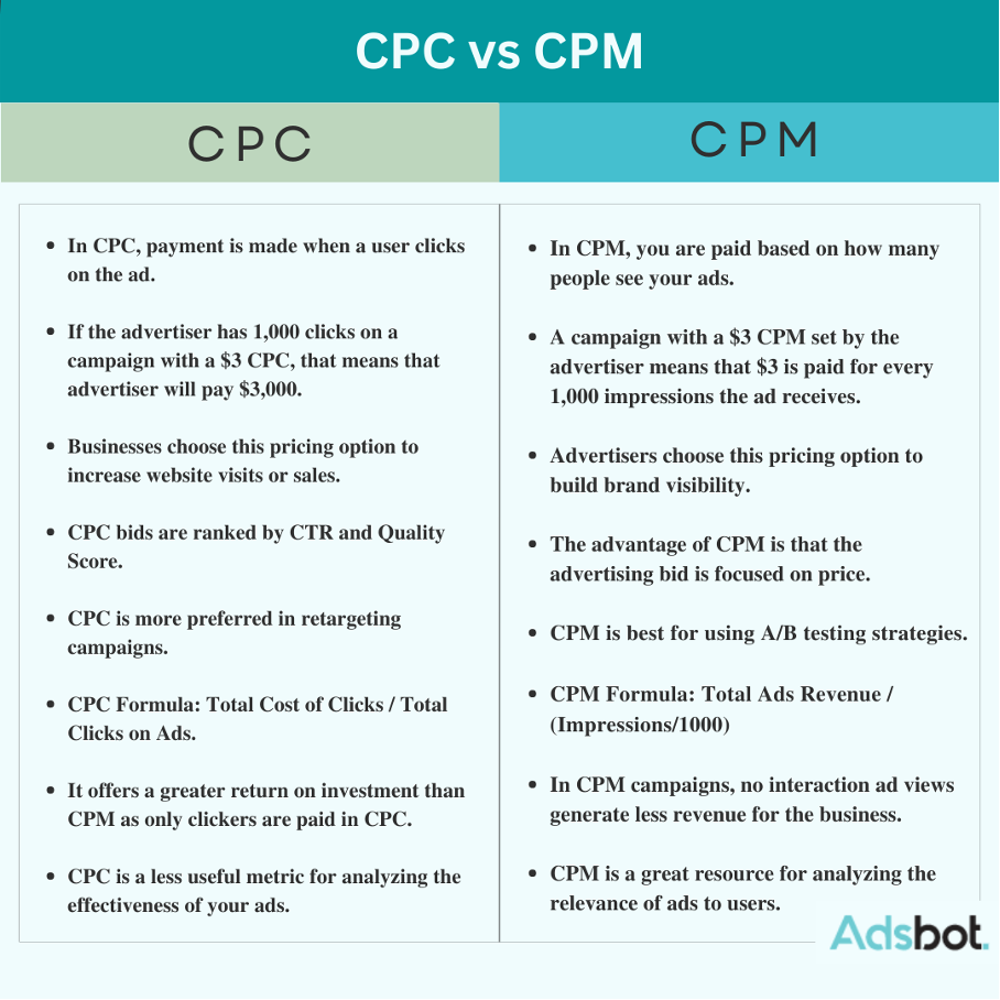 CPC stands for Cost Per Click, which means that advertisers pay for each click on their ad. CPM stands for Cost Per Mille, which means that advertisers pay for every 1,000 impressions of their ad.